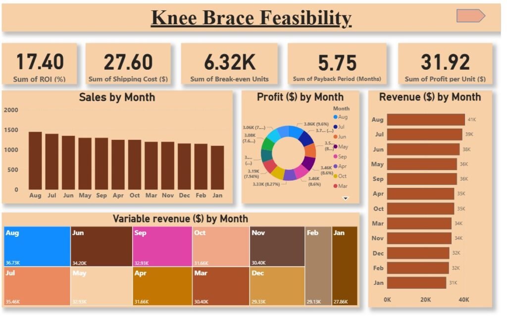 This Knee Braces Feasibility Dashboard delivers a sophisticated analysis of revenue dynamics, profitability trends, ROI performance, and break-even thresholds.