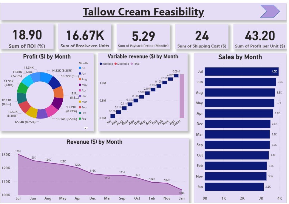 A comprehensive visualization of key financial metrics, this dashboard analyzes sales trends, variable costs, and profit behavior for tallow cream.