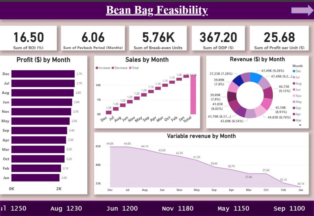 A complete feasibility analysis for the Bean Bag product, showcasing monthly revenue patterns, profit trends, ROI, and variable costs.