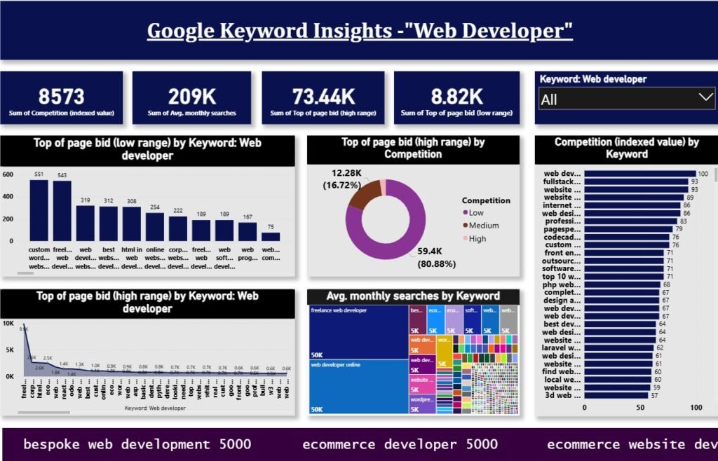 This Power BI dashboard analyzes “Web Developer” keywords, quantifying market demand (209K monthly searches) and competition intensity (8573 index value). It visualizes top-of-page bid ranges and segments related terms, providing actionable insights for SEO and PPC strategy.