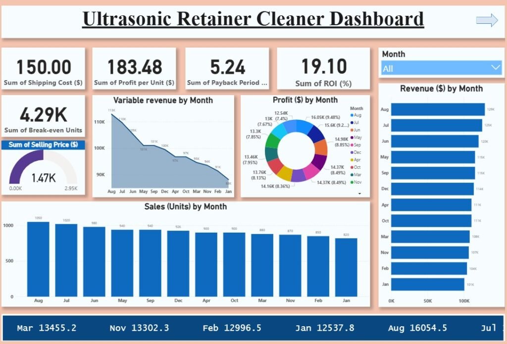 This Ultrasonic Retainer Cleaner Dashboard provides a complete view of monthly sales, revenue, profit, ROI, and break-even units.
