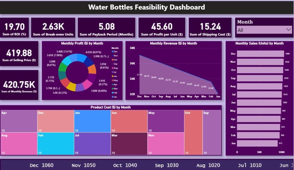 A detailed visualization of financial metrics, this dashboard evaluates sales dynamics, variable costs, and break-even thresholds for water bottles.